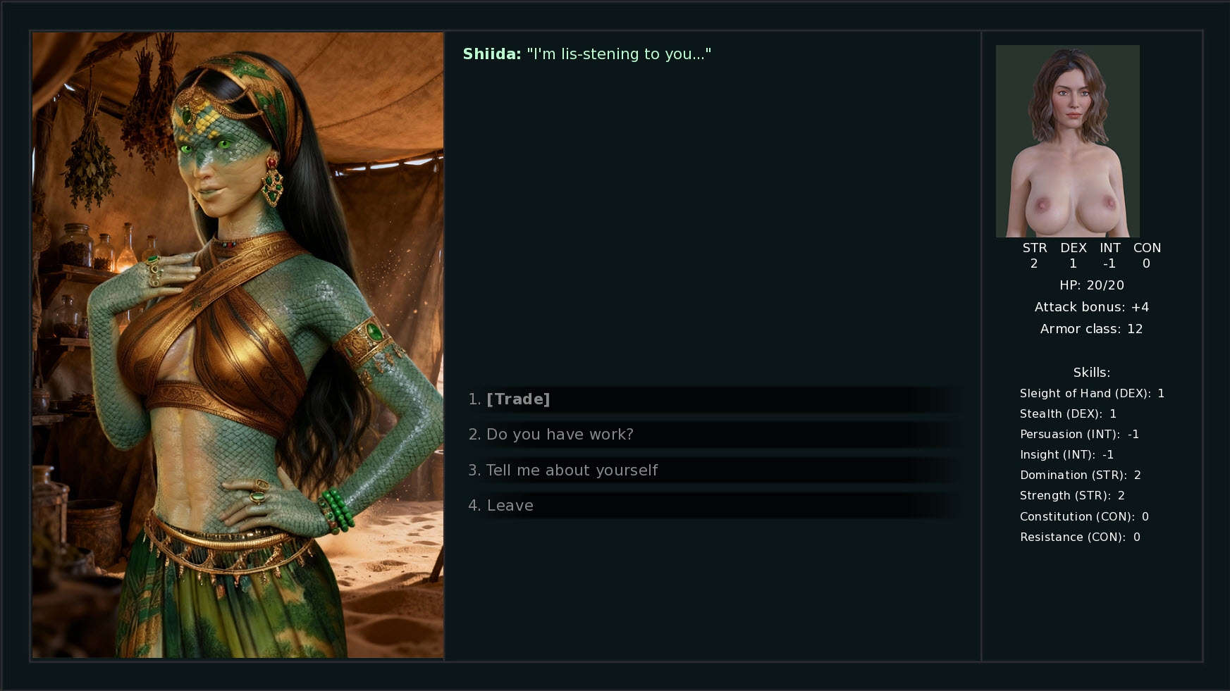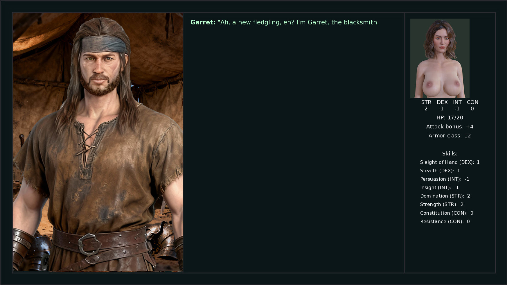 You can choose the protagonist's gender, class, and backstory. There aren't many options yet, but more is to come. Currently, the game features an inventory and trading system, crafting, a detailed quest log, dialogue, and location exploration. The leveling and combat systems are still in the prototype stage, but you can already kill a skeleton. There are also a few explicit scenes.